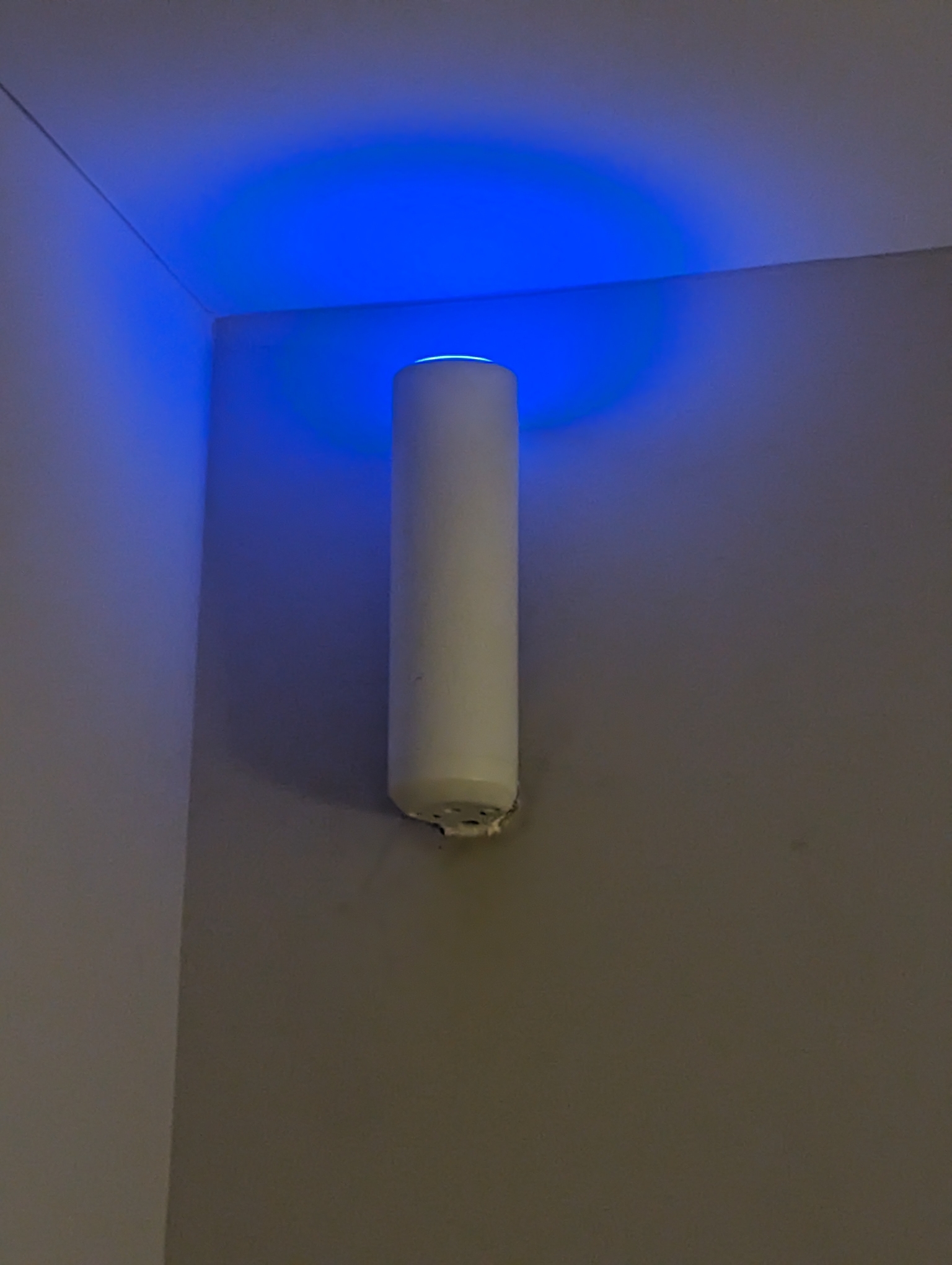 This corner of the room is near the center of the house, with the Kitchen ( and a metal oven ) on the other side of the wall. By locating the unit here the oven does not block the signal from other parts of the house. The U6-Mesh is powered over the Ethernet cable running down inside the wall to a USW-Flex switch below it.
