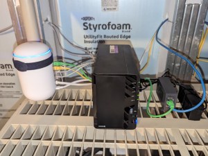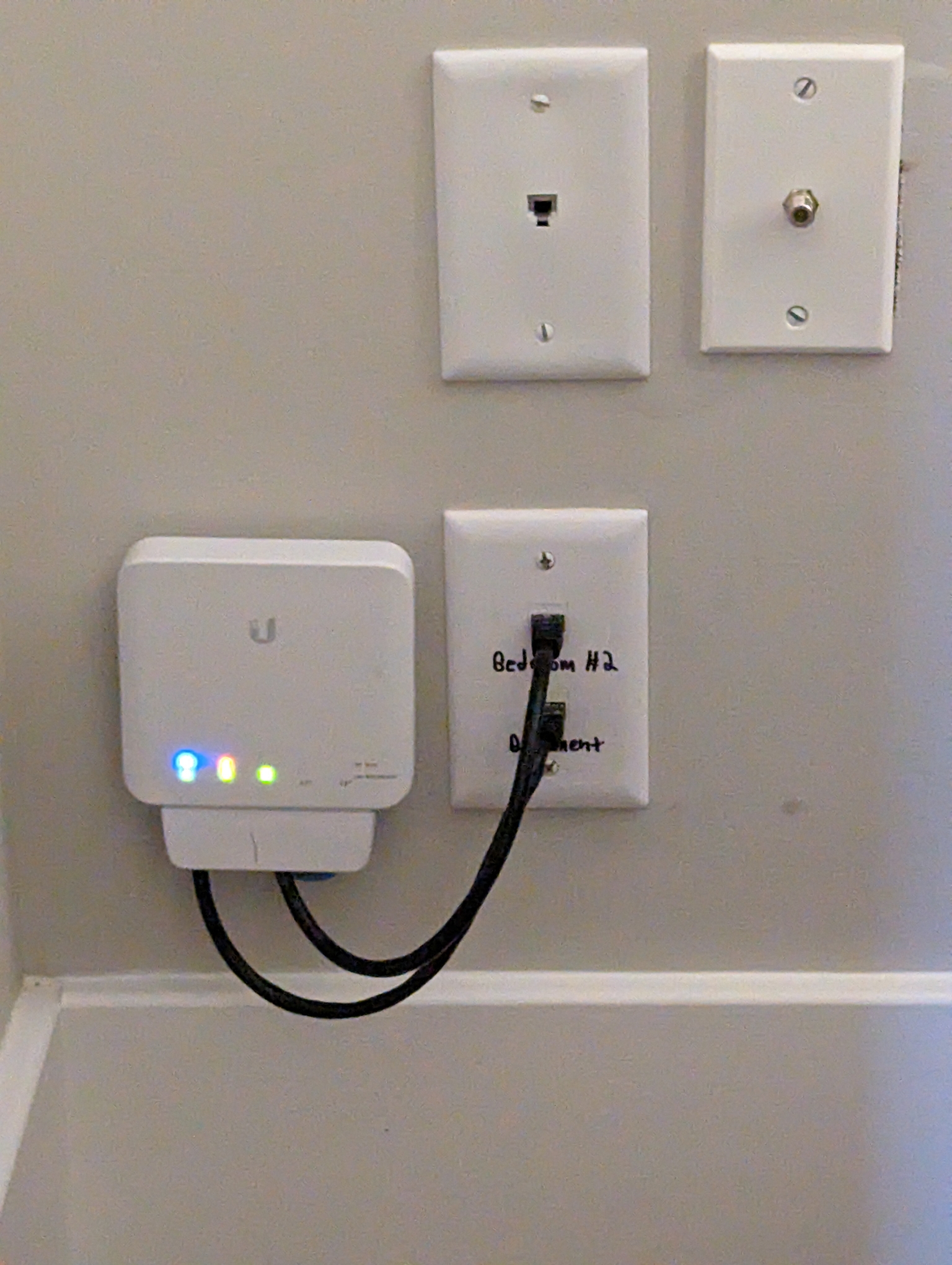 Directly below the U6-Mesh unit we installed the USW-Flex power-over-ethernet switch. One Cat 6 cable ( not visible ) was fished up the wall to the U6-Mesh.