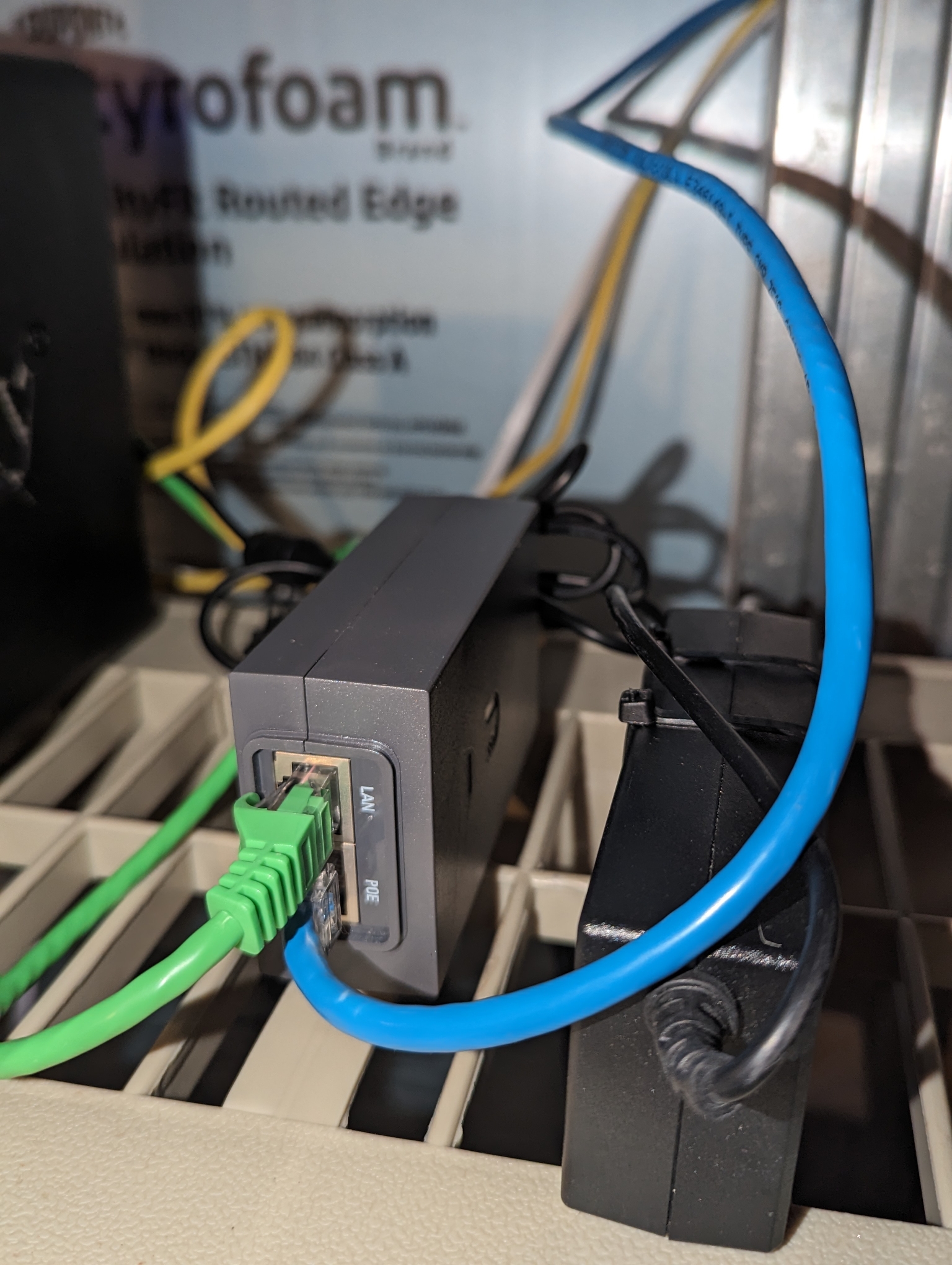 A close up of the POE++ (60W passive ) injector in the basement is here. The USW-Flex switch is specially designed for using POE++ inputs and supplies one POE+ output to the U6-Mesh, as well as the Switch’s power.